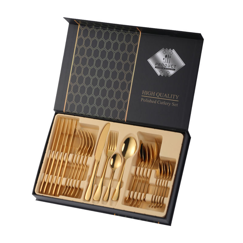 Descripción Eleva tu experiencia culinaria con nuestro juego de cubiertos en acero inoxidable de 24 piezas, presentado en un estuche elegante. Importados con precisión, estos cubiertos fusionan funcionalidad y estilo para satisfacer las demandas de tu hogar o restaurante. Cada pieza refleja artesanía de alta calidad, ofreciendo durabilidad y resistencia a la corrosión. El diseño ergonómico garantiza comodidad en cada uso, mientras que la presentación en el estuche añade un toque sofisticado a tu mesa. Transforma tus momentos gastronómicos con esta colección única que combina la belleza estética y la practicidad, estableciendo un estándar excepcional en utensilios de cocina.Contiene 1 Set de de cubiertos de 24 piezasColor Dorado